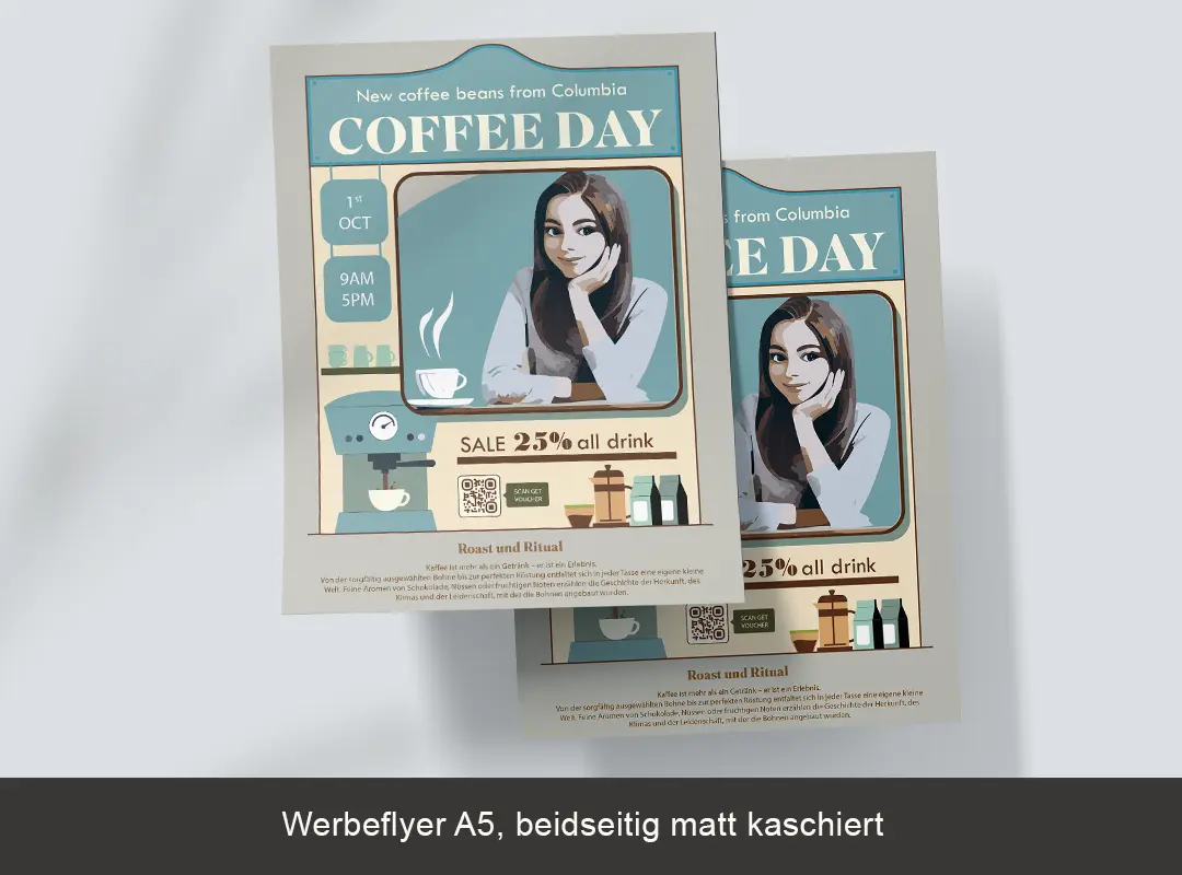 (Die Druckkosten sind nicht enthalten und abhängig von der Papier-Qualität und der Auflage Ihres Flyers. (Z.B. belaufen sich die Kosten für 1000 Stk je nach Papierqualität und Veredelung zwischen ca. 100,- € und ca. 350,- €))